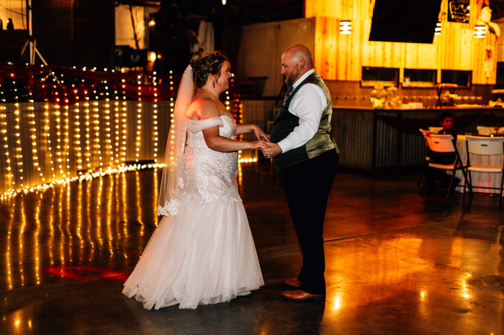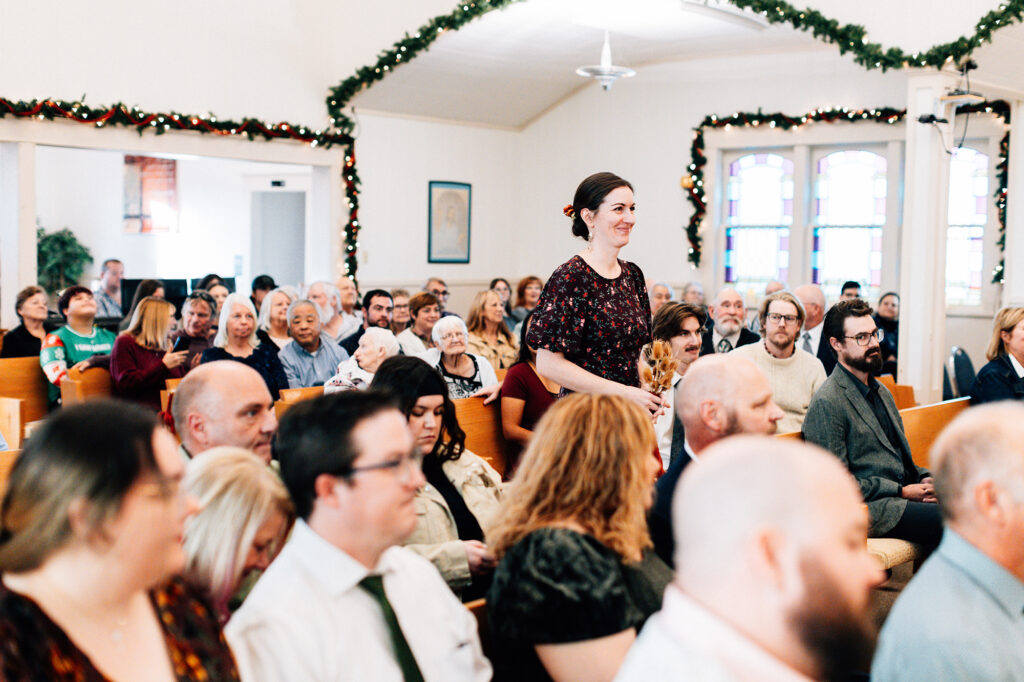 A beautiful marriage ceremony officiated by the Bride’s Brother in Law and the couple shared vows, rings, and a kiss to seal the deal! Guests showered the brand new Mr. and Mrs. with bird seed as they excited the church for a quick walk down the street to the reception! Beautiful lights strung everywhere, a thank you wall full of lovely thrifted mugs, and so many soups to choose from filled the reception. Special first dances preceded a lot of little dancers enjoying the dance floor. The couple cut their wedding cake (A tiny nephew had maybe taken a bite out of the cake before the couple could get to it, we’ll just assume that’s good luck!) We finished our time with Lorna and Andrew by surrounding them with all of their people for a group photo!